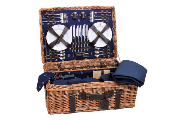 Malle pique-nique osier et cuir bleu - 6 personnes